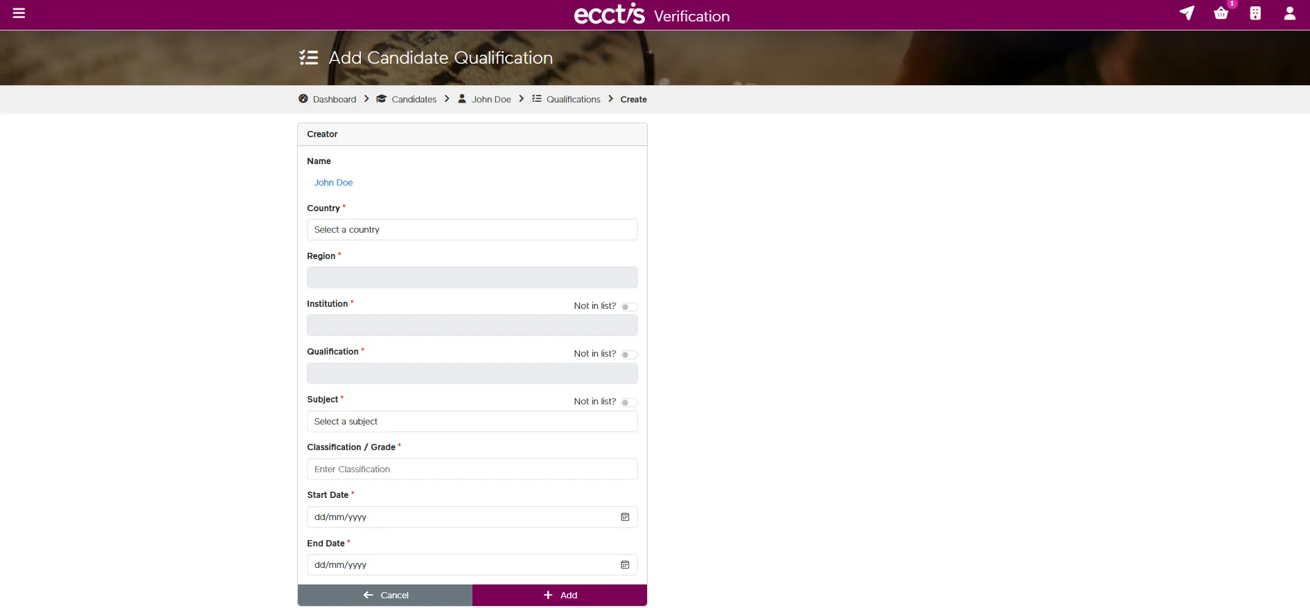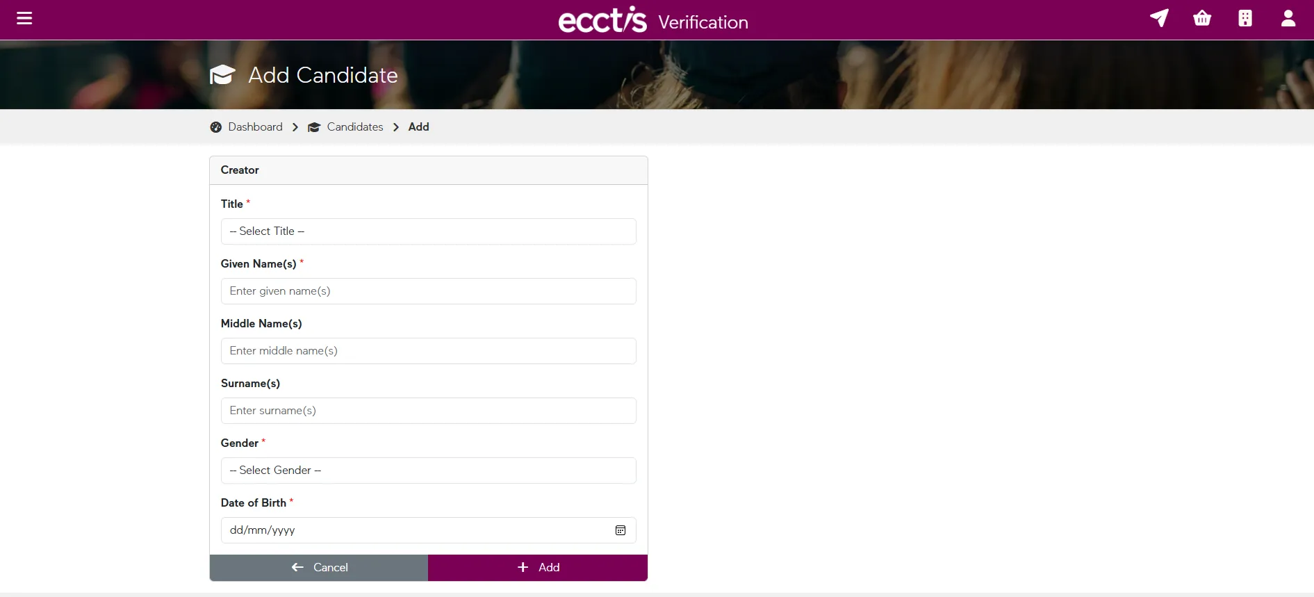 Create a candidate record by entering the core personal details needed to begin the verification process. This sets up the profile that the qualification and supporting evidence will be linked to.