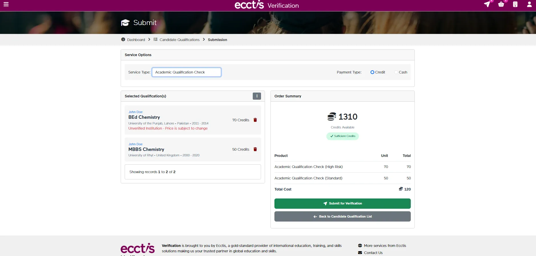 Review the request summary, confirm the selected qualifications and check the credit total before submission. Once everything is correct, the request can be submitted for verification.